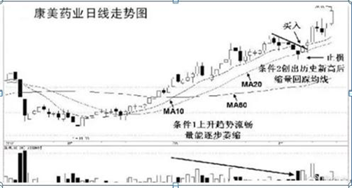 条件2:股价在创出历史新高后,缩量回落至(MA10、MA20、MA60)均线附近止跌企稳。