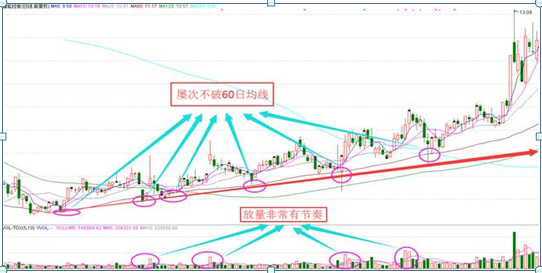 此类主力往往不具备控盘的实力,故采用此手法尽量减轻上行时的压力。台阶式拉升往往出现在流通盘适中的中小盘,主力高度控盘,长线运作。股价沿30日均线一路盘升,遇到大盘调整时一般也不破60日均线。