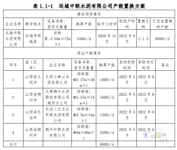 运城中联水泥有限公司原计划拟在山西省运城市芮城县建设一条4400t/d水泥熟料生产线。退出产能来自3条线,共计产能6600t/d。