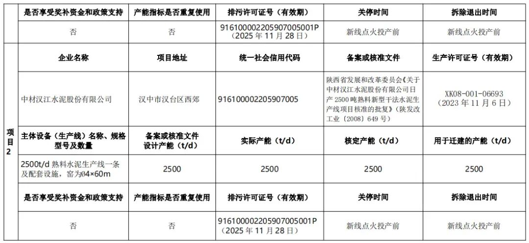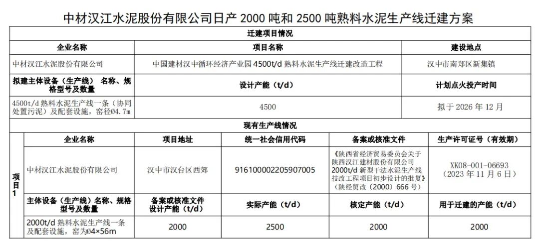 水泥网APP梳理相关信息发现,中材汉江水泥股份有限公司原计划退出2000t/d和2500t/d熟料生产线各一条,迁址建设一条4500t/d熟料水泥生产线;