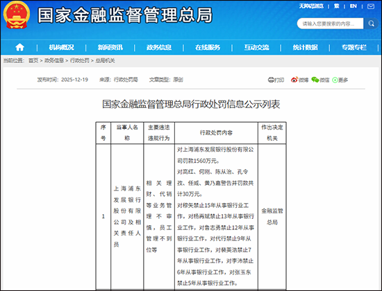 此外,国家金融监督管理总局网站12月19日披露的罚单显示,浦发银行因相关理财、代销等业务管理不审慎,员工管理不到位等被罚款1560万元。
