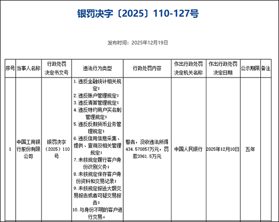 同日,工商银行也因违反金融统计相关规定、违反账户管理规定等10项违法行为被警告,被没收违法所得434.570857万元,罚款3961.5万元。