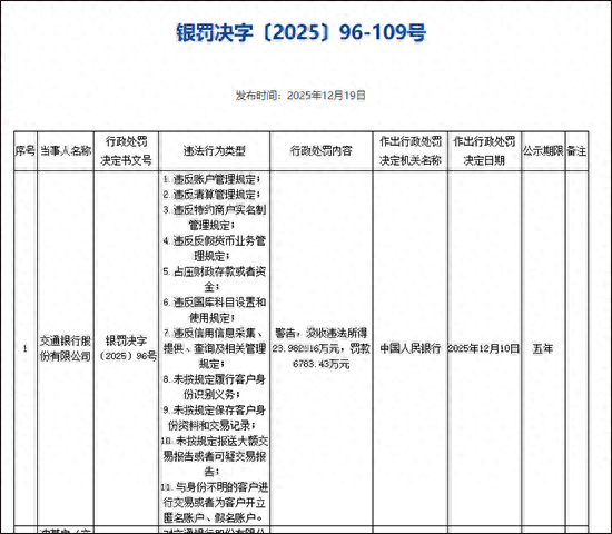 中国人民银行网站12月19日消息,央行发布行政处罚信息显示,交通银行因违反账户管理规定、违反清算管理规定等11项违法行为被处以警告,并被没收违法所得23.982116万元,累计罚款约6783.43万元。