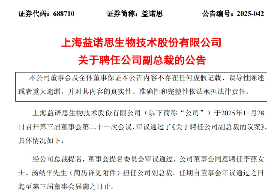益诺思召开董事会会议,通过聘任李燕、汤纳平为公司副总裁的议案。