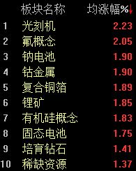 板块方面,光刻机板块走强,同飞股份、中光防雷、美埃科技涨幅较大。锂电池产业链发力上涨,华盛锂电、鹏辉能源、滨海能源、天际股份等涨幅居前。