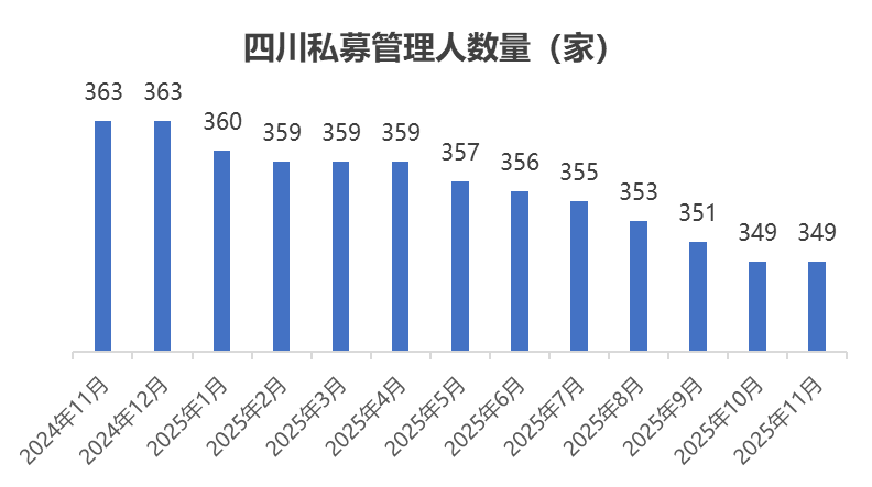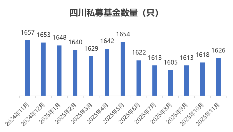 2025年11月,四川无新登记私募基金管理人,无新注销私募基金管理人。截至11月末,四川省注册私募基金管理人349家,全国位于第8名(浙江与宁波合并计算,广东与深圳合并计算),管理基金数量1,626只,管理规模3,119.72亿元。
