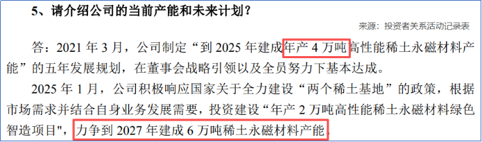 在11月27日的投资者关系活动记录表中,金力永磁披露道:2021年,公司制定的“年产4万吨高性能稀土永磁材料产能”目标,已经基本实现;未来,公司还将投建新的项目,争取到2027年建成6万吨稀土永磁材料产能。
