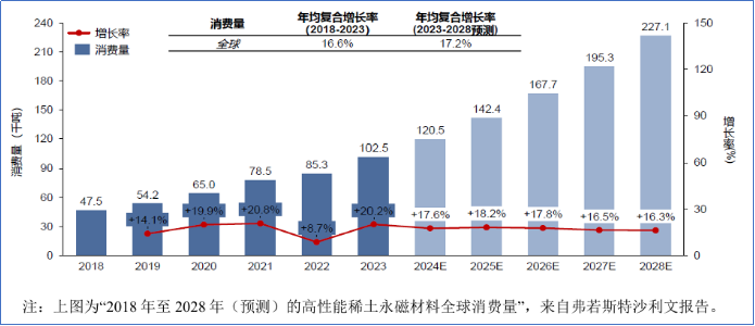 弗若斯特沙利文的报告显示,全球高性能稀土永磁材料消费量由2018年的4.75万吨增至2023年的10.25万吨,复合年增长率高达16.6%。据预测,到2028年,这一数据有望达到22.71万吨,需求十分广阔。