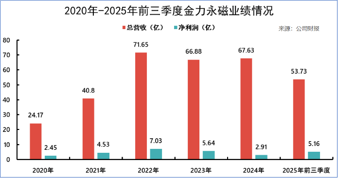 2020年-2024年,金力永磁总营收从24亿提高至67亿,年复合增长率达29.33%;2025年前三季度,实现营收53.73亿,同比继续增长7.16%。