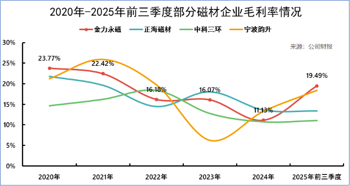 2025年前三季度,金力永磁实现毛利率19.49%,超越了宁波韵升的18.36%,更明显领先于正海磁材的13.32%、中科三环的11.01%,盈利能力较强。