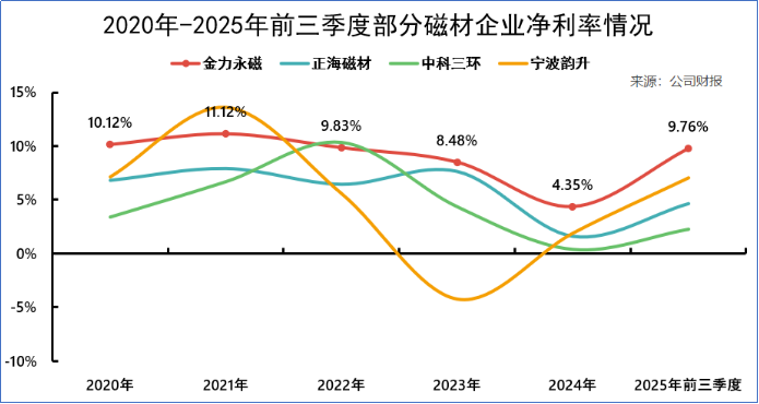 2025年前三季度,在期间费用率没有大幅变动的情况下,金力永磁的净利率反弹至9.76%,与宁波韵升的7%、正海磁材的4%和中科三环的2%形成了不同档位。