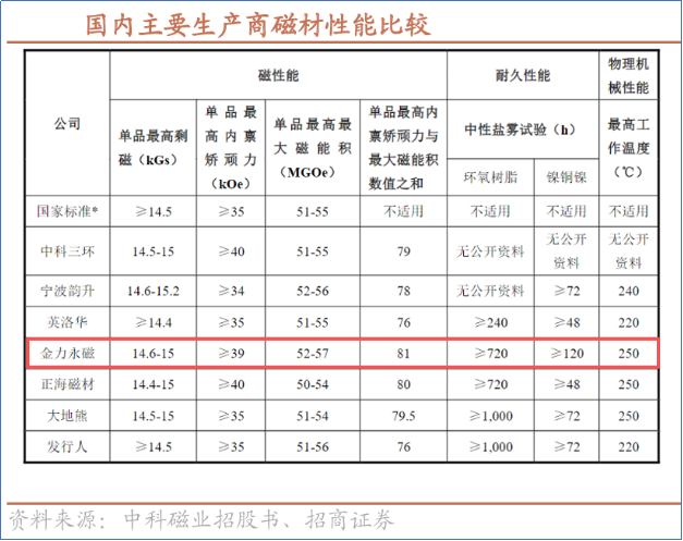 对比国内主要生产商的磁材性能,可以看出:金力永磁的单品矫顽力和磁能积“双强”,二者数值之和达81,超越了正海磁材、大地熊、中科三环等企业,处于国内领先水平。