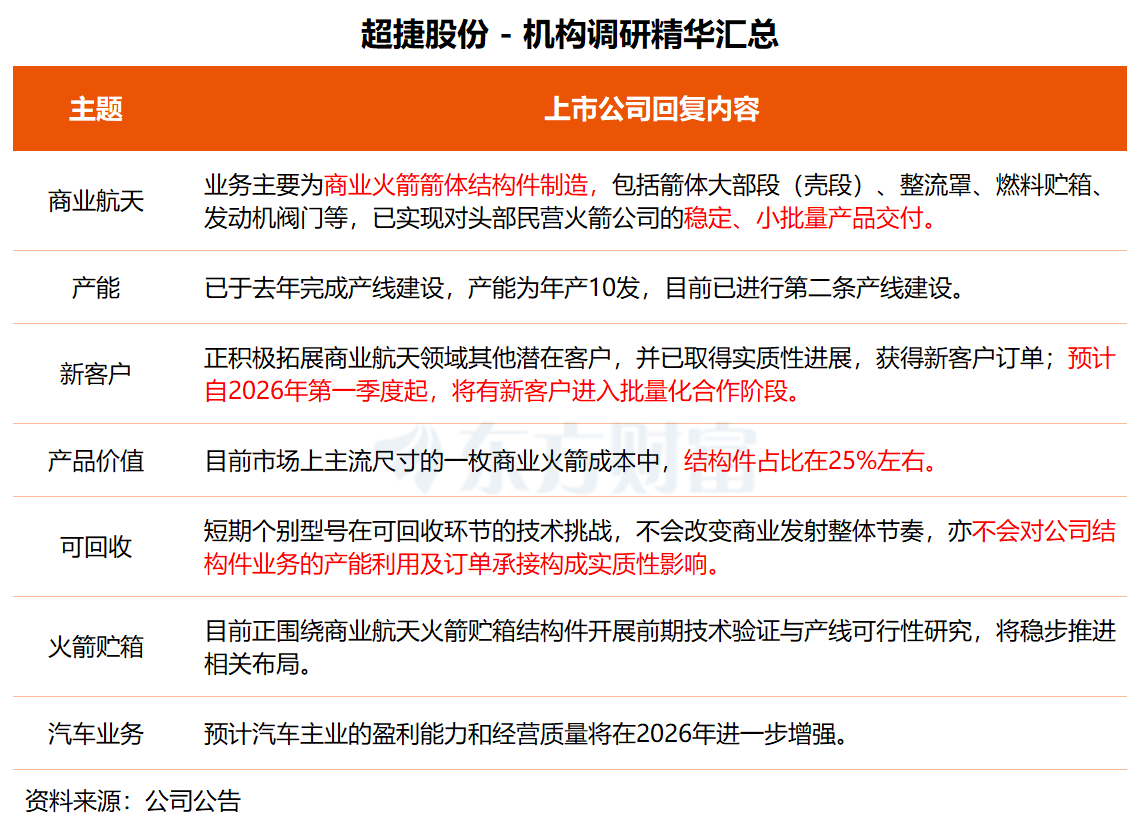 超捷股份昨日接受国金证券、招商基金等8家机构调研,公司在交流中透露,公司今年以来持续拓展新的商业火箭客户,并已取得实质性进展,获得新客户订单。预计自2026年第一季度起,将有新客户进入批量化合作阶段。