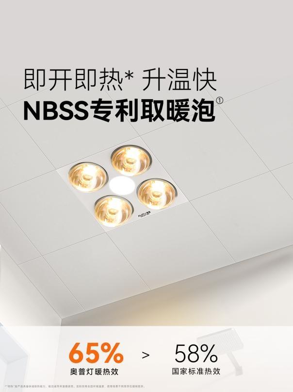 奥普作为中国浴霸的开创者,1993年研发出中国第一台集取暖、照明、换气于一体的浴霸,是浴霸国家标准的主要制定者。奥普灯暖浴霸D20B采用NBSS专利取暖泡,即开即热,升温快。热效达 65%,高于国家标准热效 58%,带来高效取暖体验。浴霸寿命长达 2000 小时,以每次2小时计算可使用10年。内部负压氮气搭配表面镀膜设计,即便灯泡破裂也能有效防止碎片飞溅,提升使用安全性。具备高效换气通道,解决暗卫通风不便的困扰,灯泡四周换气口快速换气排走雾气,清新浴室、整机防潮、绝缘阻燃、环保无味,专业防护更安全。