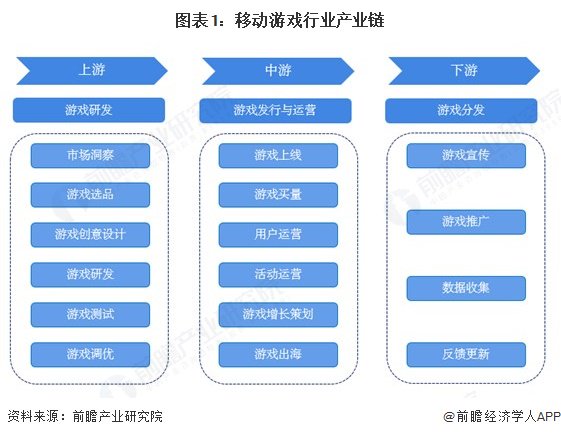 中国移动游戏的产业链上游为游戏研发,中游为游戏发行与运营,下游为游戏分发。其中,游戏研发环节包括市场洞察、游戏选品、游戏创意设计、游戏研发、游戏测试和游戏调优等步骤,游戏发行与运营则包括游戏上线、游戏买量、用户运营、活动运营、游戏增长策划、游戏出海等过程,游戏分发则是在不同平台进行推广宣传、数据收集、反馈更新的过程。