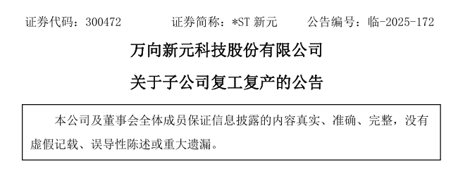 12月23日,万向新元科技股份有限公司(下称 “万向新元”)发布公告,宣布旗下两家此前临时停产的全资子公司已正式具备复工复产条件,相关生产经营活动逐步恢复有序开展。