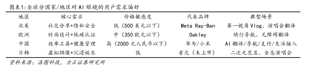 AI 眼镜存在需求,在全球主要消费地区受环境、人文影响,消费倾向差异明显。成熟消费市场追求“情感价值化”,比如 Meta 用户为自拍买单;发展中市场需求“生产力与工具化”,中国用户为效率付费。