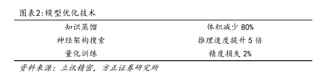 过去 AI 眼镜发展受限于技术,目前技术突破 AI 眼镜快速发展。预计 2025 年 AI 眼镜行业出货量超 1000 万副,Meta 数量 500 万副。该量主要因为技术进步。第一,端侧中小模型普及,适配低算力和高隐私场景。过去两年,采用强化学习和知识蒸馏的技术,使得小型模型展现出显著的能力提升,它们支持语音识别、实时翻译、文档摘要等功能,实现本地 AI 的部署和应用。第二,可穿戴设备芯片算力提升,垂类小模型实现自然交互。