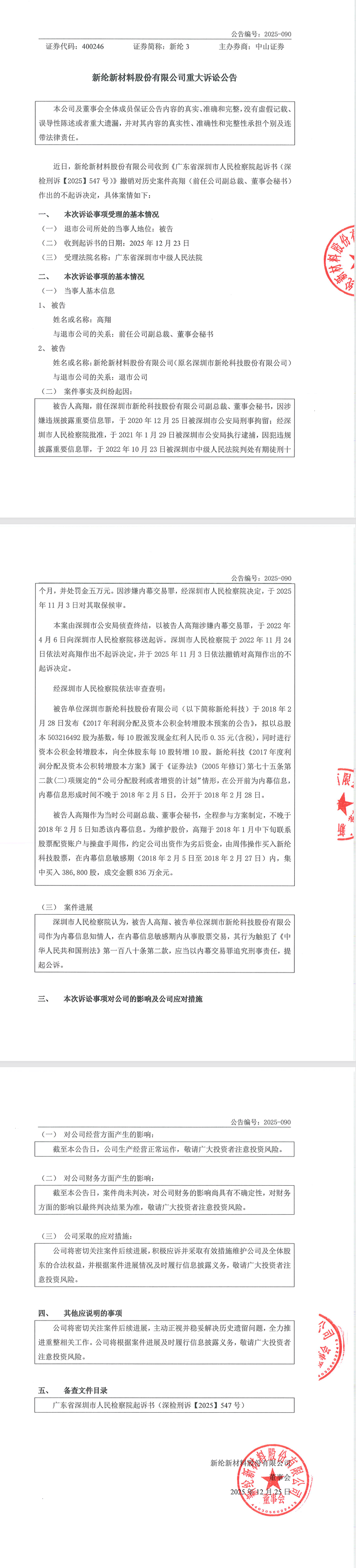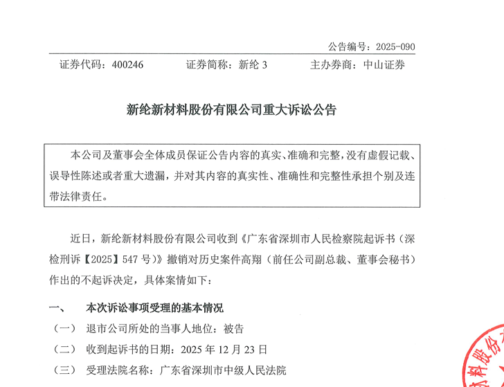 近日,新纶新材料股份有限公司收到《广东省深圳市人民检察院起诉书(深检刑诉【2025】547 号)》,其中涉及撤销对历史案件中高翔(前任公司副总裁、董事会秘书)作出的不起诉决定,具体案情如下: