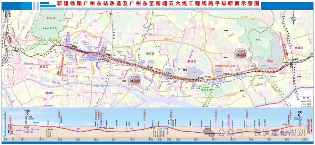 广州东至新塘五六线全长约30公里,设计时速200公里,途经天河区、黄埔区、增城区,与既有广深铁路并行。该线路可连通广州东、新塘等枢纽客站,连接起广汕高铁、广深铁路、赣深高铁等线路以及规划建设的广清永高铁等铁路。