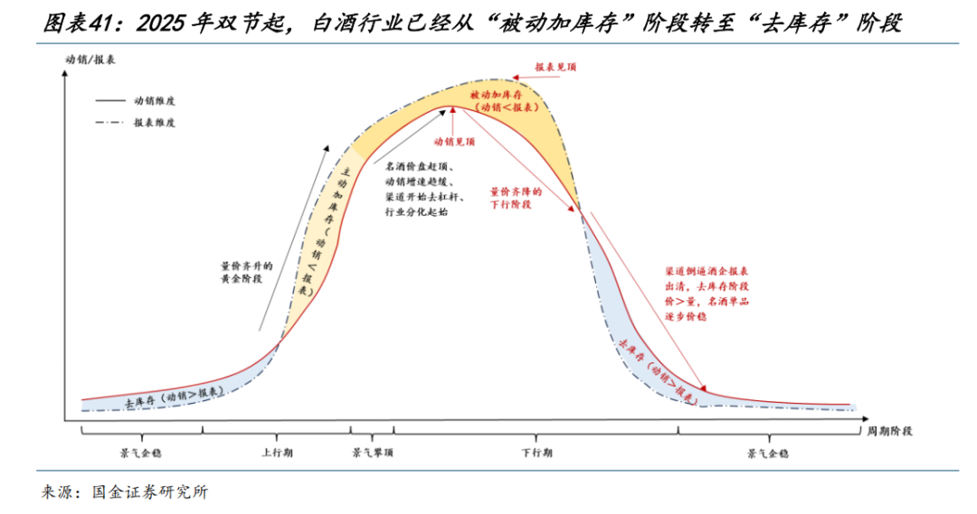 从产业周期维度来看,自2025年中秋&国庆起白酒行业已经处于显性“去库存”周期,这意味着:1)酒企报表已步入显性出清通道,且短期跌幅将明显高于动销口径以达成社会库存去化的目的;2)行业价格竞争情况将进一步趋缓,酒企将从“以价换量抢份额”思路切换至“控价稳量抓好基本盘”。