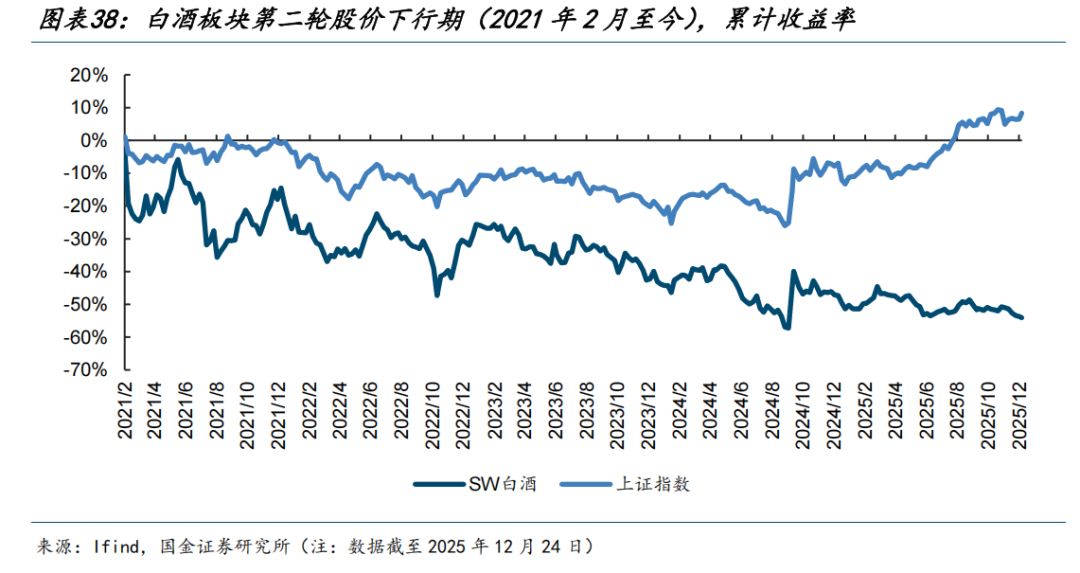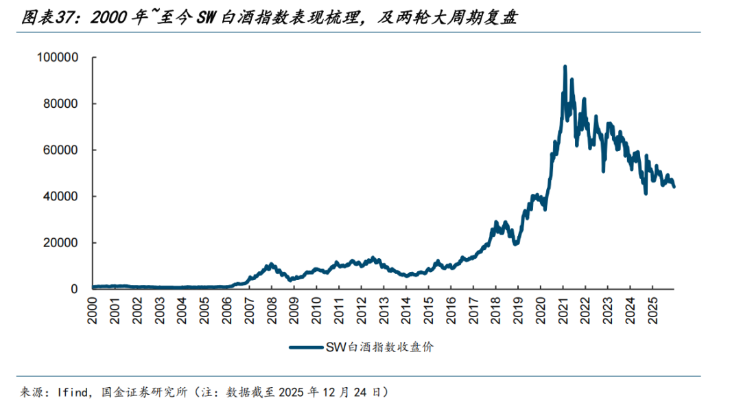 从股价层面复盘来看,白酒板块自2000年以来经历过两轮大周期(2004~2012年上半年、2014~2021年初),两轮大周期区间收益率分别达到1873%、1572%。此轮白酒板块的下行周期起始于2021年初,迄今为止股价低点为2024年9月下旬、自2021年高点回撤约57%,接近2012年下半年~2014年初的回撤幅度(约58%)。