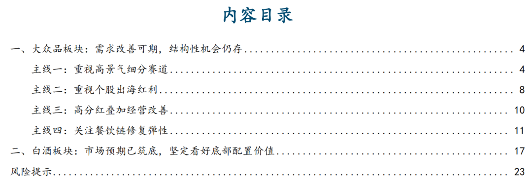 主线四:关注餐饮链修复弹性。2025年在消费缺乏增长动能、酒类政策约束、预制菜事件发酵等背景下,餐饮端需求持续承压。倘若内需政策持续加码,餐饮端有望实现较大的修复弹性,其中啤酒、速冻、定制餐调板块相关度更高。建议关注海天味业、啤酒&速冻板块。