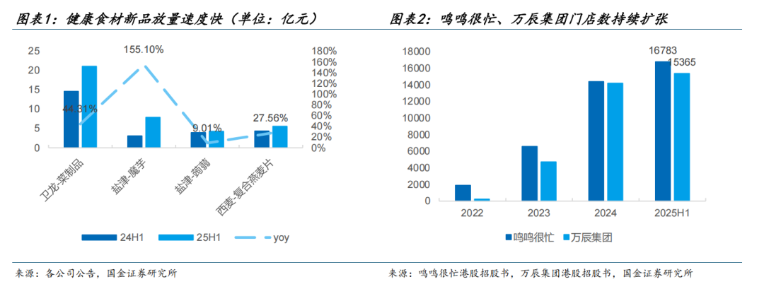 新渠道整合深化,零食企业逐步分化。零食新渠道红利从粗放扩张转向深度整合与效率提升,继续驱动行业增长但加剧企业分化。量贩零食头部效应显著,鸣鸣很忙门店突破2万家,万辰集团整合为“好想来”后通过集中运营提效,门店数持续增加;同时,红利向山姆等会员店和抖音等内容电商多元渗透,前者成为高价值渠道,后者推动企业运营从爆品转向SKU矩阵。