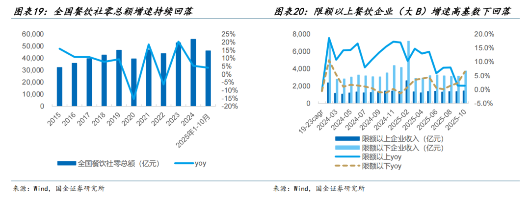 2024-2025前三季度:受宏观经济降速影响,居民可选消费支出削减,其中餐饮首当其冲。24年社零餐饮总额增速仅5.35%,自2025年5月开始,叠加酒类政策约束、西贝预制菜、全民社保等事件影响,大众餐饮亦遭遇更为明显的冲击,单月同比增速显著回落,直到2025年10月开始出现边际好转。