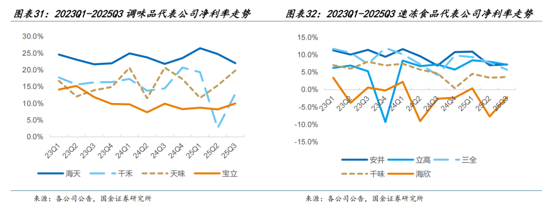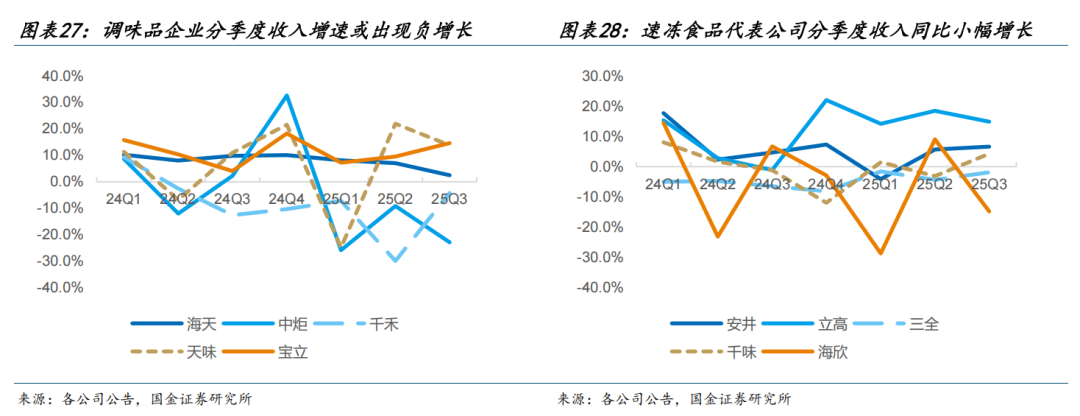 基础调味品方面,呈现龙头强者恒强态势,如今年前三季度海天稳定在10%左右的收入增速;而中炬和千禾表现疲软,前三季度收入分别下降20%/13%。其中分化的主要原因在于,1)海天作为龙头经营韧性强,内部改革效果快速兑现,对外对接新渠道研发新品夺取存量,对内精益生产提升效率,持续提升市场份额。2)政策趋于严格,居民升级速度放缓,其中自2025年3月开始零添加标识使用受限后,新规一方面整肃行业乱象行为,同时也牵制零添加行业增速。