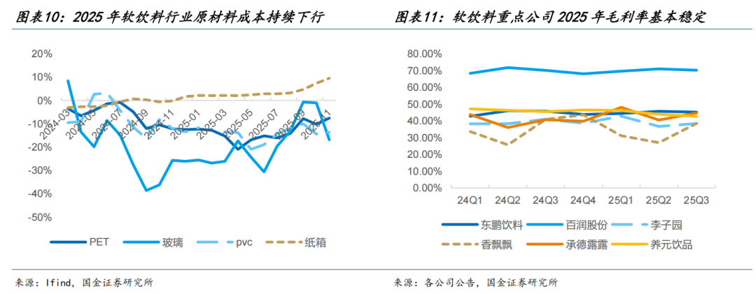 从成本端来看,随着占比较大的PET/白糖/纸箱等原材料价格下行幅度收窄,板块个股毛利率基本稳定,仅小幅波动。从费率端来看,终端需求疲软+市场竞争加剧,各家普遍强化费用投放,内部优化管理和研发费用。最终从净利率的角度看,多数企业年内净利率小幅修复,龙头表现相对稳健。