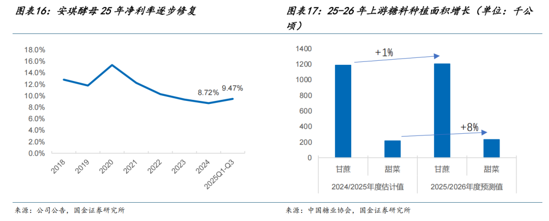 1)公司核心原材料糖蜜约占比总成本25-30%,受供需错配影响价格持续3年高涨,对毛利造成显著冲击。公司自2022年开始自建水解糖产能,目前可替代30%糖蜜原材料。同时伴随着上游扩产、粮食作物价格下行,2025Q1-Q3毛利率顺利实现2.3pct修复,我们预计2025/2026年新榨季成本有望进一步下降,对应毛利率改善1-2pct。
