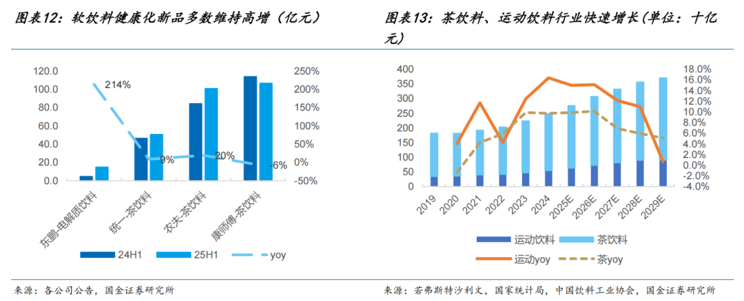 从新品类表现来看,软饮消费呈现出健康化、低糖化、低脂化升级趋势,如电解质水、无糖茶、椰子水等品类快速爆发,据若弗斯特沙利文数据显示,茶饮料自2021年开始恢复增长态势,并呈现加速增长态势,2022-2024年增速分别为5.9%/9.9%/9.7%。对应到农夫山泉/康师傅/统一企业中国2025H1茶饮料规模分别为100.9/106.7/50.7亿元,增速分别为20%/-6%/9%,其中无糖茶为增长核心驱动力。此外运动饮料受益于大众健康意识提升、户外运动等场景全面修复,自21年起开始快速增长,若弗斯特沙利文数据显示2020~2024年运动饮料赛道复合增速为11.1%。东鹏补水啦2025Q1-Q3共实现销售收入28.47亿元,同比+135%;单Q3销售加速,实现销售额13.54亿元,持续超预期。