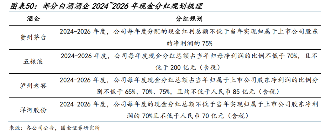 1)五粮液、泸州老窖已披露最低金额的现金分红规划、测算来看股息率>4.5%,洋河股份股息率>7%;