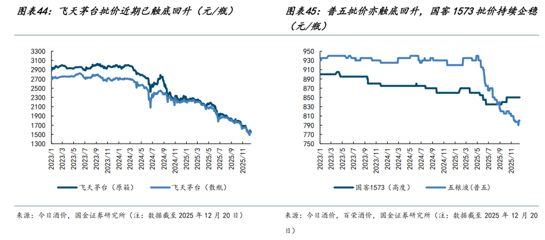伴随行业景气度回落,白酒头部单品2025年跌价情况加剧。考虑到目前白酒行业景气度尚未触底,因此市场对行业价格竞争、核心品价盘的预期仍偏谨慎,尤其12月时飞天茅台批价一度跌至临近指导价。相对而言,我们认为当前已是行业价盘筑底窗口期、市场偏谨慎的价格预期有望环比修复。主要源于: