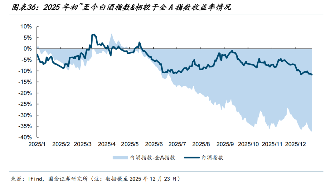 通过复盘2025年白酒板块行情,核心仍以基本面预期交易为主。年内板块α机会为2月交易春节动销反馈、即春节动销录得低预期下略超预期的表现,但与2024年相似、今年节后动销反馈同样转淡,在此基础上叠加5月18日中共中央、国务院印发修订后《党政机关厉行节约反对浪费条例》,基于消费场景约束超预期地对白酒行业需求产生影响。至中秋&国庆双节,渠道反馈已印证禁酒令等外部风险事件对白酒消费场景的约束有环比改善迹象,同期上市酒企报表录得加速出清,自此市场对白酒基本面预期逐步企稳,白酒板块相对收益未再单边下行。