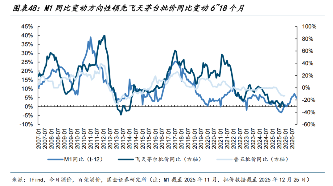 2)M1同比增速领先飞天茅台批价变动约6~18个月,流动性宽松一方面通过提升经济活跃度、带动企业和居民端消费;另一方面,通过资产升值财富效应间接推动白酒消费。