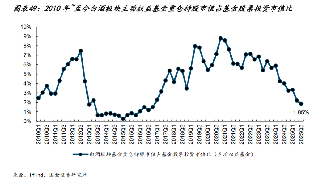 和行业景气度相匹配的是,白酒板块基金持仓已经降至低位。其中,主动权益基金整体持仓在2025Q3末时已回落至1.85%,预计2025Q4环比仍有所回落。