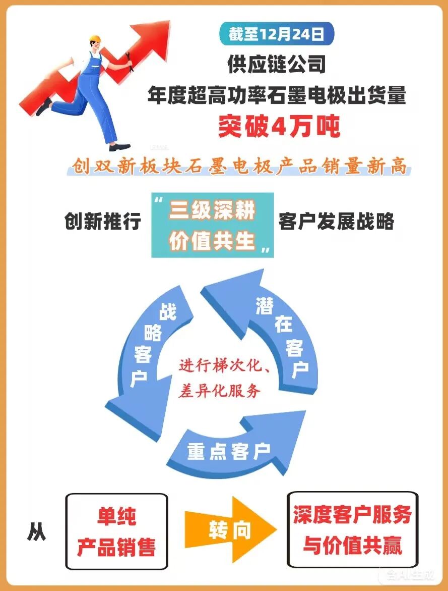 此次突破进一步巩固了该板块石墨电极产品在行业内的领先地位。据了解,供应链公司坚持“服务质量提升与销售增量提升”双轮驱动战略:在国内市场,深入开展“客户深耕攻坚行动”,为战略客户量身定制全流程服务方案,推动客户数量与销售总额实现同步增长;在海外市场,着力打通跨境结算与信息壁垒,通过直接参与国际招投标提升直销比例,优化全球供应链布局。