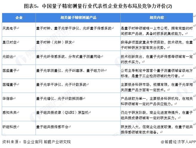 目前,中国量子精密测量行业中,国盾量子、国仪量子、国睿科技、中科酷原、中微达信、未磁科技、天奥电子、星汉时空等企业均具有较强的竞争力。其中,国盾量子中国量子科技产业化的引领者,量子通信、量子计算、量子精密测量三大板块业务形成“一体两翼”战略布局,其布局量子磁强计、量子陀螺仪、量子加速度计、量子重力仪等量子精密测量产品,具备较强的行业竞争力。此外,国盛量子致力于将量子测量技术与工业实际需求结合,专注于量子传感器的研发和应用,实现高端量子传感设备的产业化。并主导制定中国首个量子测量领域省级地方标准,是量子工业检测领域的先行者,其竞争力同样不可小觑。