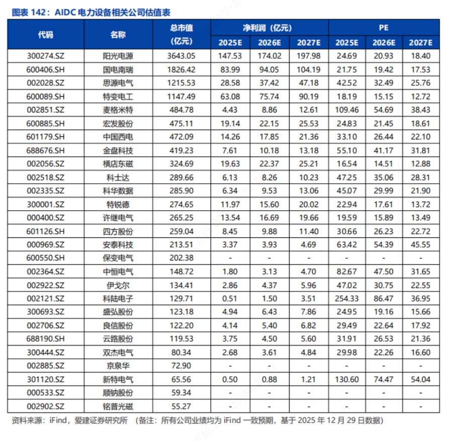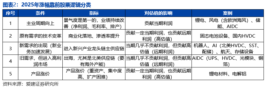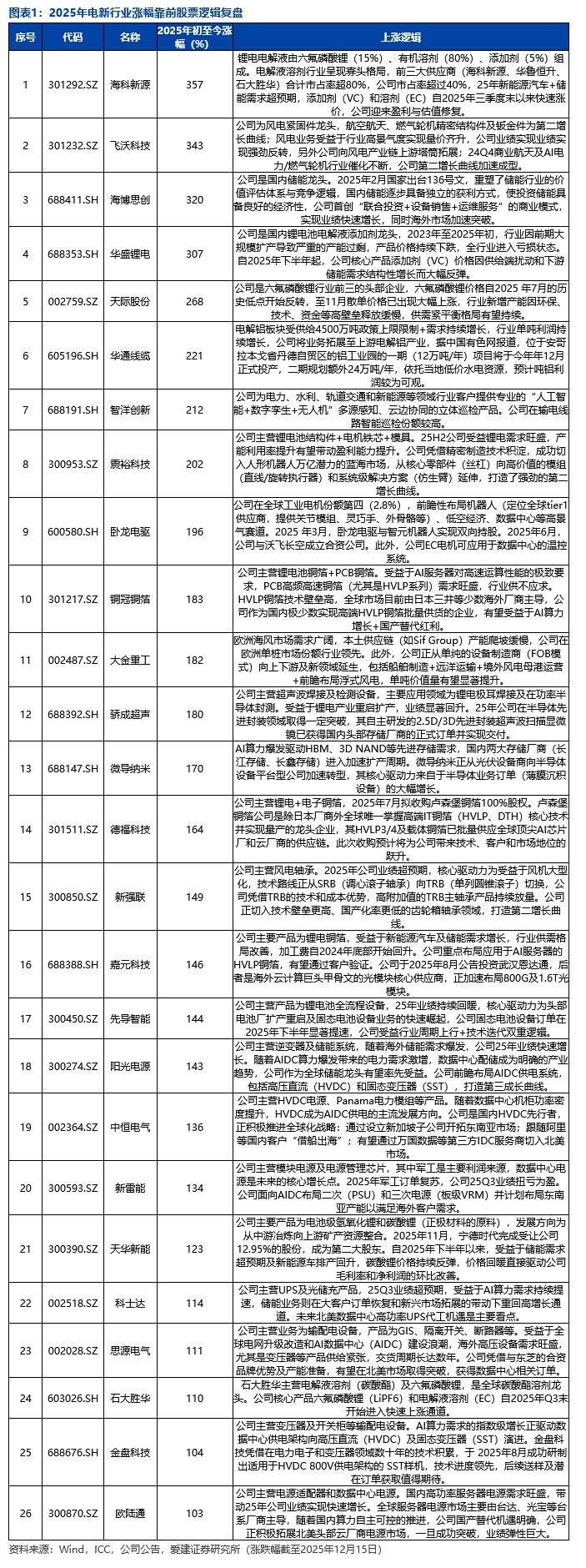 2025年上涨逻辑复盘:我们复盘了SW电力设备涨幅靠前的股票上涨逻辑:2025年A股涨幅靠前的股票,其上涨逻辑可系统归纳为五大类型:1)主业处于景气上行周期,如锂电、风电、储能及AI数据中心(AIDC),凭借持续改善的净利润、毛利率和高排产兑现当期利润;2)原有需求因技术变革而重估,如固态电池设备、国内高压直流输电(HVDC),既贡献部分当期业绩,又因渗透率提升获得远期估值溢价;3)新需求爆发,如人形机器人、AI算力基础设施(北美HVDC、SST、配储)、商业航天、存储设备等,虽当前利润贡献少,但因切入新兴产业龙头供应链而具有高估值;4)旧产品打入高利润海外市场,尤其是具备北美本地化产能的企业(如AIDC相关的UPS、HVDC、光模块、铜箔等),虽短期利润尚未释放,但因潜在获取海外高毛利订单具有成长溢价;5)产品涨价驱动的重资产行业,如锂电材料、电解铝,受益于供给刚性、集中度高和扩产受限,在提价中同时实现当期盈利改善与未来盈利预期上修。