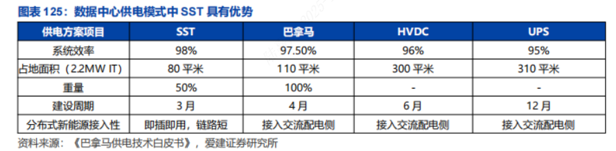 SST具有高效高集成度以及便于绿电直连的特点。1)高效率:对比传统UPS,SST系统的全链路效率可明显提升,对于负载率为90%的2.5MW的系统,能够省电约59万度/年;2)高集成:SST直接将AC10kV转换为DC800V,通过直流母线传输至服务器电源架,再通过一级DC/DC变换即可转换为DC48V,避免多数中间步骤,从中压变压器到列头柜,SST系统占地面积不足传统UPS的50%,且重量更轻;3)绿电直连:SST以DC800V输出,该电压便于与分布式光伏、储能等源网荷储设备进行直流侧并网,SST系统能够避免部分转换调整环节,简单可靠,降低成本。