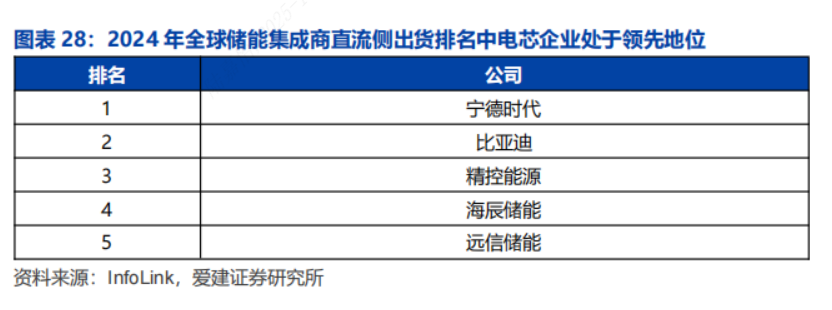 系统集成:电芯厂与PCS厂相互垂直整合竞争。根据出货时是否带PCS,储能系统可分为直流侧储能系统(不带PCS)、交流侧储能系统(带PCS)。2024 年度,全球储能系统集成商交流侧Top5 企业为Tesla、阳光电源、中车株洲所、Fluence、海博思创;全球储能系统集成商直流侧Top5企业为宁德时代、比亚迪、精控能源、海辰储能和远信储能。