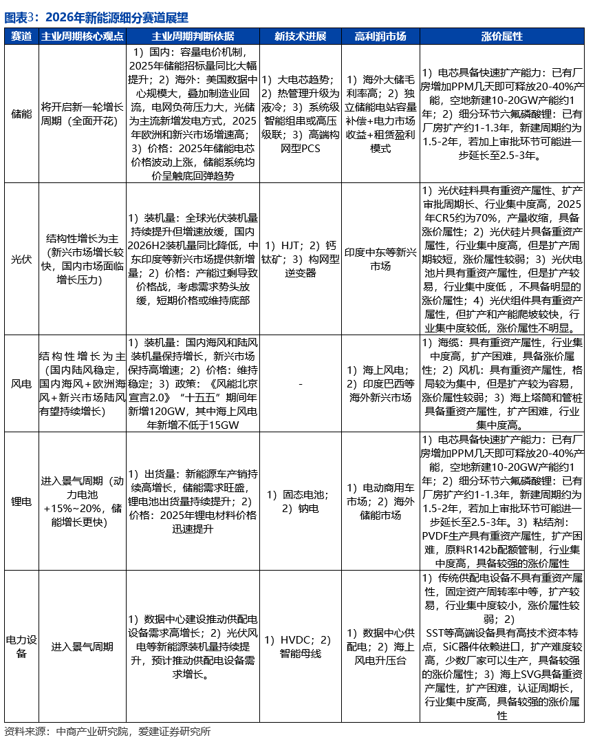 2026年展望:我们认为2026年市场依然会延续2025年的选股逻辑框架,但考虑比价效应+资金容量+想象空间,市场演绎方向预期将从龙头拔估值→到比价扩散+新主线崛起。看好预期低+兑现概率大的新能源细分主线。储能:1)美国数据中心配储。2)储能板块业绩兑现。3)电芯涨价:2026H1电芯涨价确定性较高,单瓦盈利上涨则为潜在新主线(第一轮涨价为原材料涨价带动电芯涨价,第二轮涨价为电芯紧缺带动电芯本身盈利能力上涨)。4)风险:储能系统集成成本上涨导致集成商毛利率下滑;储能需求因电芯涨价而受到抑制。光伏:1)太空光伏;2)硅料涨价;3)新技术;4)光伏企业积极转型第二曲线(光伏+半导体;光伏+机器人;光伏+储能等)。5)风险:需求疲软导致主业周期持续向下。风电:1)海缆涨价;2)风机涨价;3)国内深远海催化;4)海外陆风加速增长。锂电:1)原材料及电芯涨价;2)固态电池。电力设备:1)数据中心供配电;2)电力设备出海。