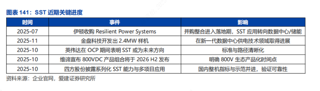 SST系统集成:凭借技术领先、品牌优势以及与下游数据中心领先企业的长期合作关系,国际巨头在SST产业化进程中处于领跑位置。维谛、伊顿、台达、ABB、西门子、施耐德等是中游SST制造的核心企业,将上游的功率半导体、高频变压器等零部件集成为完整的SST产品:维谛正与英伟达合作开发800VHVDC解决方案,并计划在2026年推出支持英伟达的计算平台;据普华有策统计,台达、伊顿、维谛等跨国企业合计市场份额超过60%。