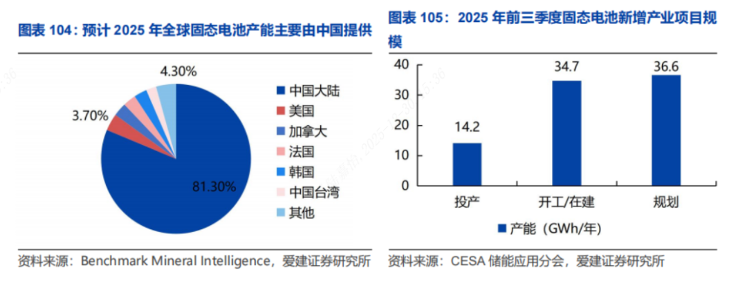 区域:固态电池产能主要由中国提供,规划产能逐步提升。全球固态电池产能中国占比最大。中国受益于全产业链优势和政策支持,具有全球各主要区域最大固态电池产能,据Benchmark Mineral Intelligence预测,2025全球固态电池产能中国占比80%以上。国内固态电池产业在建和规划产能高。2025Q1-Q3,共有41个固态电池产业项目更新动态,新增年产能总计85.5GWh,其中新增规划产能约为36.6GWh。中国固态电池产能规划和建设有序推进,将持续维持高产能。按区域划分,中国将持续保持最高产能的地位,有利于国内固态电池产业链加快完善升级,促进产业化落地。
