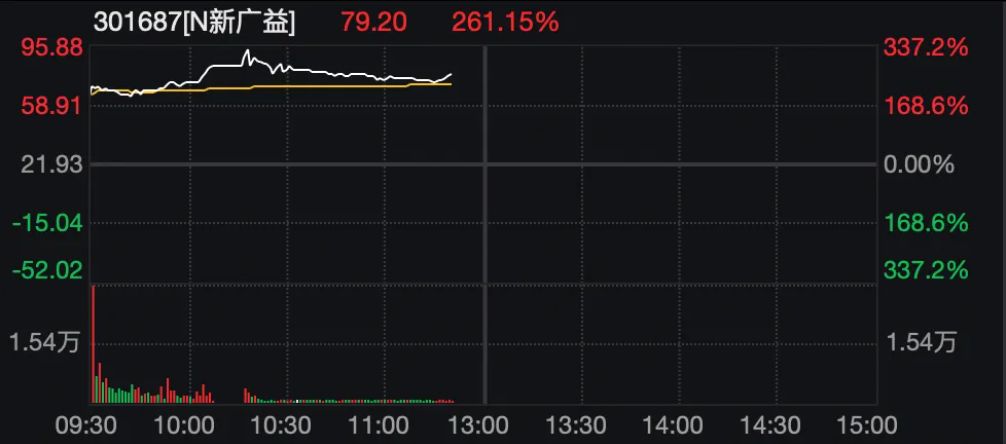 另一只新股新广益盘中一度触发临停,最大涨幅为337.21%。