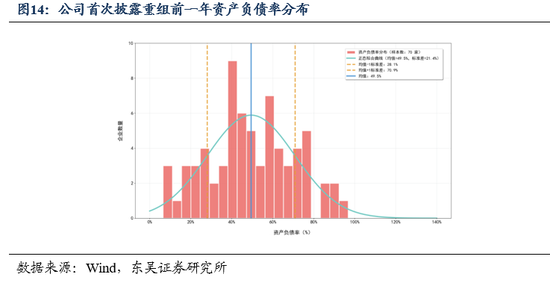 资产负债率:公司资产负债率符合正态分布,均值±1标准差范围[28%,71%]。