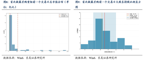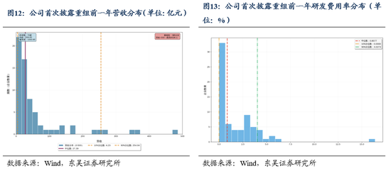 公司营收:公司首次披露重组前一年的年度营收呈明显右偏分布,大部分企业集中在0-50亿元区间,中位数为27亿元。