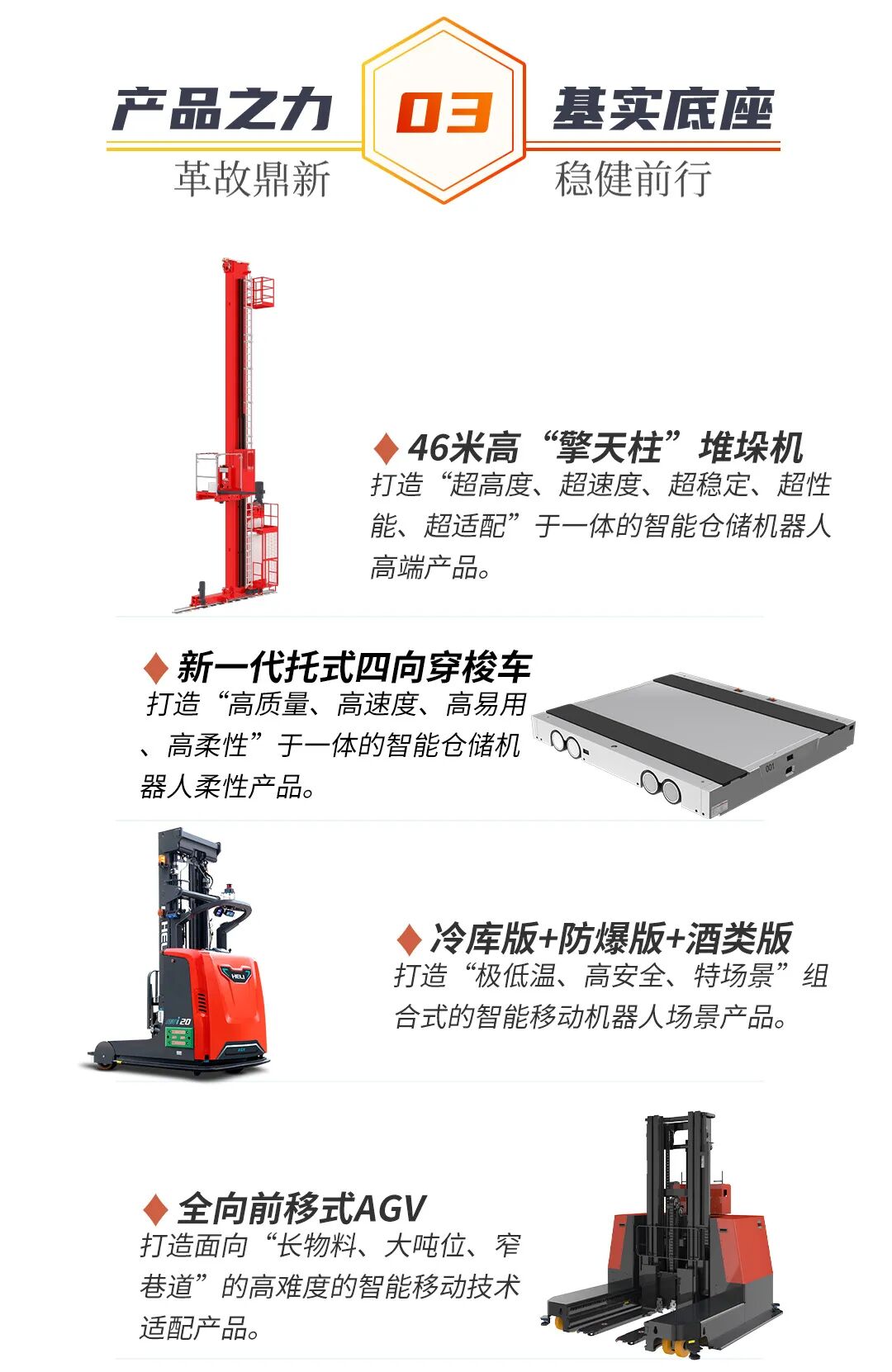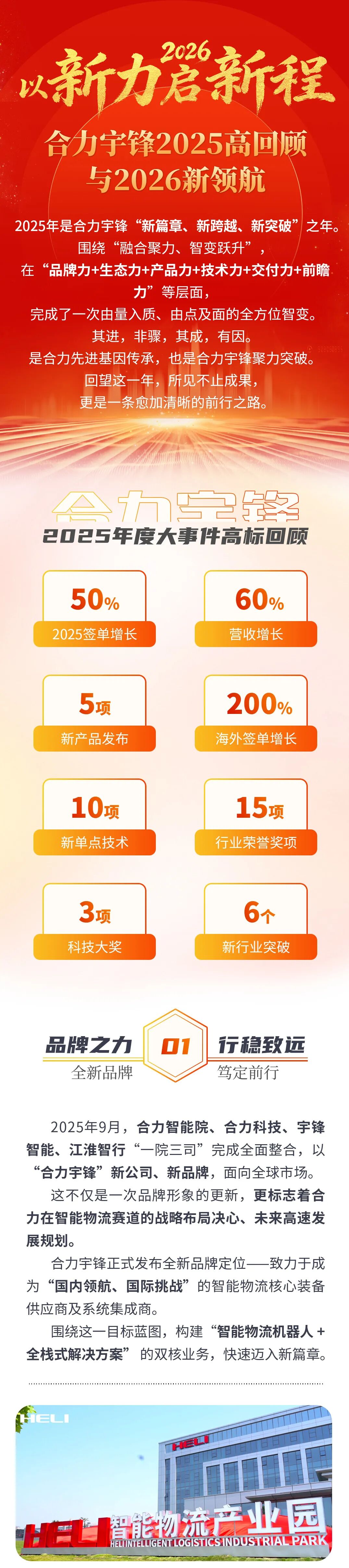 合力宇锋布局“智能仓储、智能搬运、智能工厂、智能园区”四大核心业务,基于合力近70年先进技术基因,构建“智能物流仓储机器人+智能移动机器人”等产品矩阵,自主研发“智能集成系统+孪生平台”等产品图谱。携手合力全球1000多家营销服务机构,为客户提供“项目咨询、方案规划、产品研制、实施交付、售后运维”等全周期智能物流全栈式解决方案综合服务。并在“新能源、化工化肥、酒水饮料、食品冷链、汽车、轮胎、冶金、军工”等多个行业打造标杆示范项目。